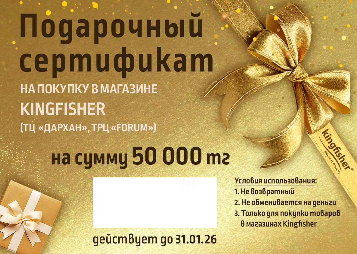 - Только для покупки товаров в магазинах Kingfihser (Магазин на Айманова - ул. Айманова, 155, торговый дом "Дархан", первый этаж и Магазин в Форуме - FORUM торгово-развлекательный центр, Сейфуллина проспект, 617)